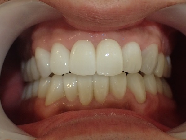 对微笑时可见的8颗上前牙进行全瓷冠矫正使其变白。